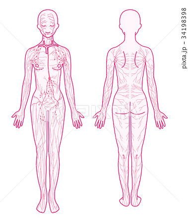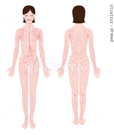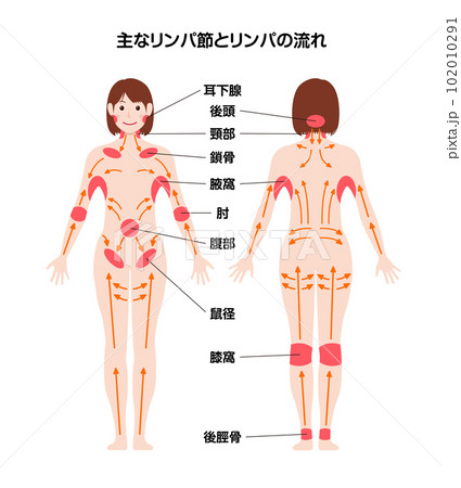 主なリンパ節の場所とリンパの流れる方向 全身図解ベクターイラスト