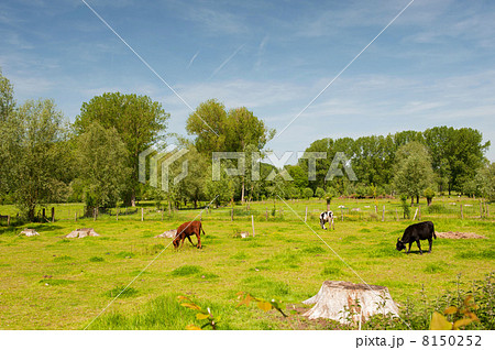 Green meadows with grazing cows at the Groote Heide nature reserve at the Dutch Belgian border around Neerpelt, Flanders, Belgium