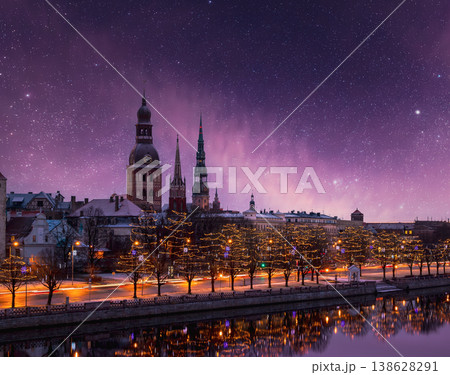 Illuminated Old Riga skyline over the Daugava River under a starry winter night sky