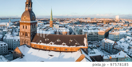 Aerial view of the winter Riga old town - the capital of Latvia. Beautiful winter over Riga.