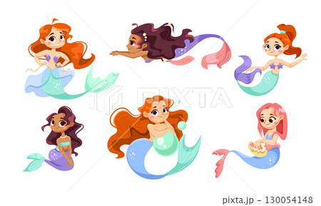 A collection of colorful and playful cartoon mermaids depicted in a variety of joyful poses