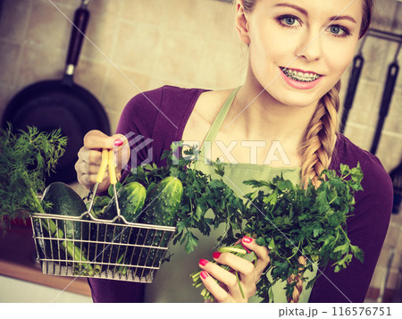 Woman in kitchen having green diet vegetables