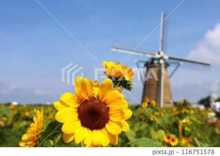 ひまわりと風車の夏風景(佐倉ふれあい広場)
