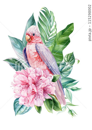 Parrot Watercolor illustration. Hand drawn tropical flora and bird design. Bird, Flowers and palm leaves greeting cards