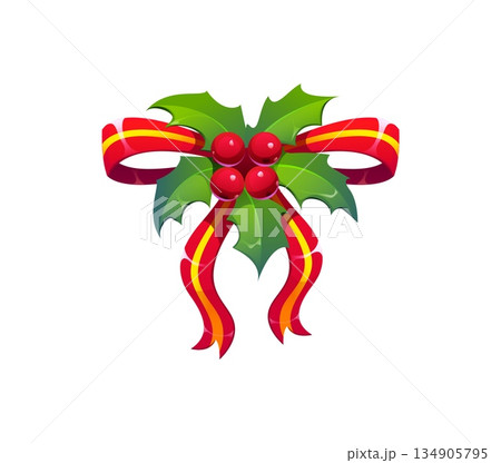 Christmas holiday cartoon holly leaf and berry decoration. Merry Christmas festive isolated vector holly leaf. Xmas winter holiday plant decoration or element with berry, red and golden ribbon bow