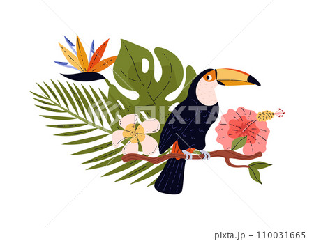 Toucan, tropical bird on a green branch, cartoon vector illustration