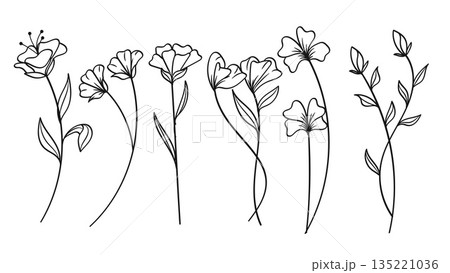 Flowers Line Art Hand Drawn Bundle Wildflower.Vector Illustration