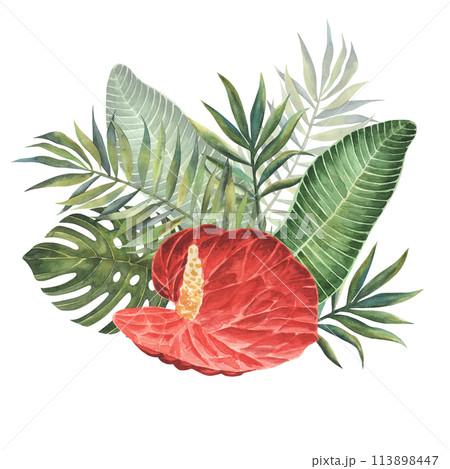 Tropical floral arrangements with red anthurium, strelitzia, heliconia and palm leaves. Watercolor illustration on white background.