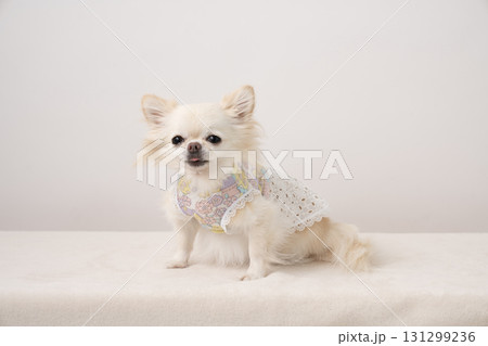 ブルーバックと風鈴と浴衣を着たチワワのラナ