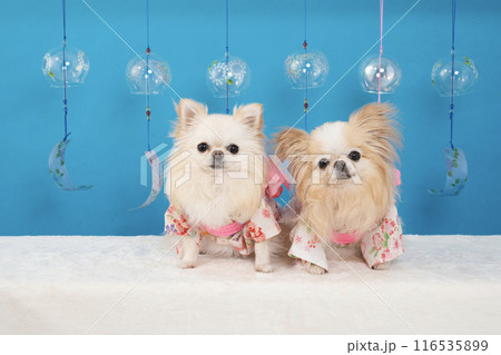 ブルーバックと風鈴と浴衣を着たチワワのルアナとラナ