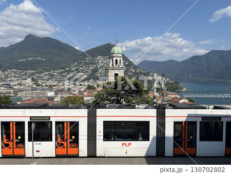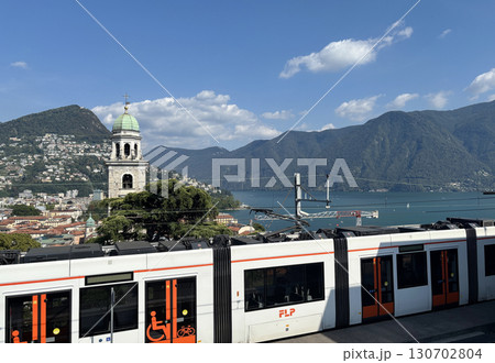 スイスのルガーノ駅から見たルガーノの大聖堂と美しいルガーノ湖。手前はポンテ・トレッサまでを結ぶ鉄道