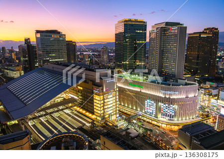 大阪市 夕焼けの空とJR大阪駅・梅田周辺の高層ビル群