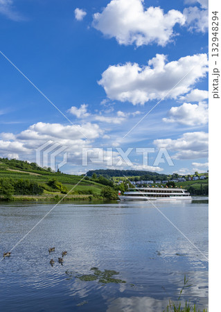 Passenger boat navigating Moselle river past Luxembourg vineyards