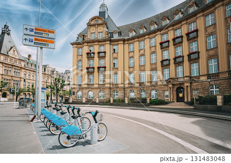 LUXEMBOURG. Row of city bikes for rent on a background of bank building