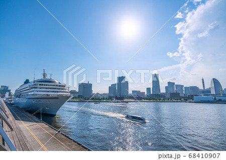 日本の横浜都市景観 横浜大さん橋の飛鳥Ⅱや「ル・グラン・ブルー」などを望む