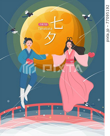 亞洲東方中國的情人節:七夕,牛郎與織女傳說人物,卡通漫畫向量人物,字幕翻譯:七夕,七月七日