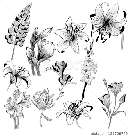 set of detailed flower sketches. Hand-drawn. design greeting card and invitation of the wedding, birthday, Valentine's Day, mother's day and other holiday