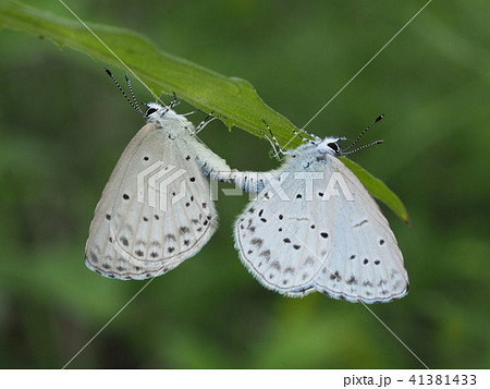 ツガイのシジミチョウとツツジの葉