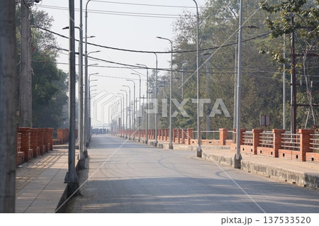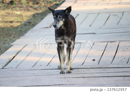 ネパールルンビニの公園の木製の道に犬がいる風景