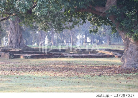 ネパールのルンビニの朝霧の中の遺跡と樹々の森の風景
