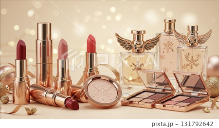 ピンクリップとパウダーとアイシャドウをビーズで飾ったメイクアップイメージ