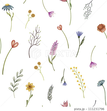 Abstract flowers seamless pattern. Watercolor background with hand drawn illustration isolated on white for card design, fabric print wrapping paper