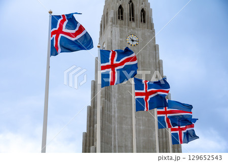 北欧の島国アイスランド 首都レイキャヴィークのランドマーク 高台に建つハットルグリムス教会と国旗