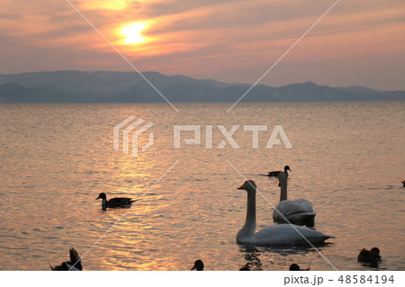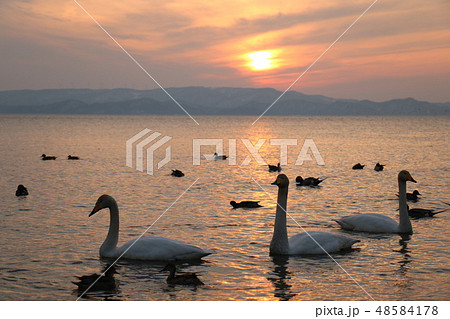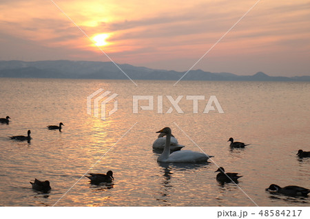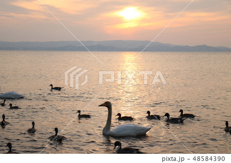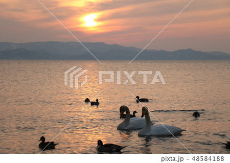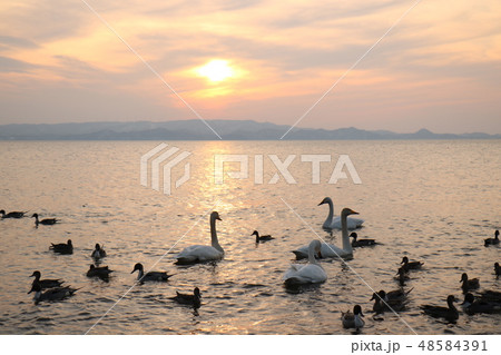 福島県の猪苗代湖の志田浜からの夕日と白鳥