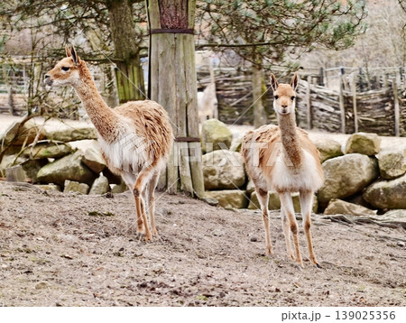 Two Animals Stand Alert By Stone Wall. Depiction Of Wary Antelope Duo Observing Their Surroundings