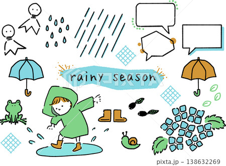 かわいい手書き! 梅雨のデザイン素材セット(フレーム・イラスト・見出し)