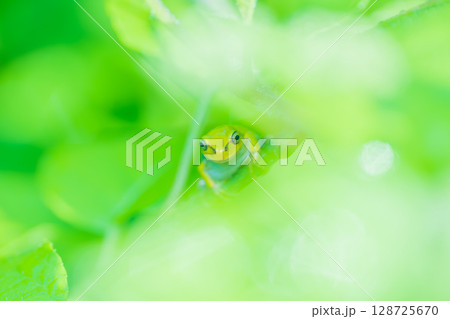 紫陽花の葉に隠れて獲物を待つアマガエル