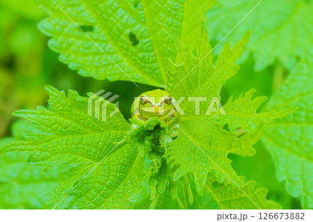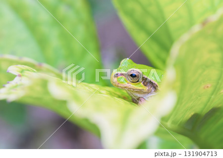 紫蘇の葉に隠れ獲物を待つアマガエル
