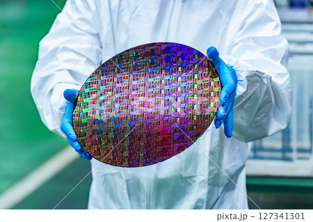 半導体工場でシリコンウエハーを持つ防護服を着た作業員