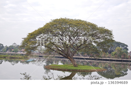 A stunning view of a giant rain tree standing gracefully in the calm waters of Mae Ngat Dam, Phrao District, Chiang Mai