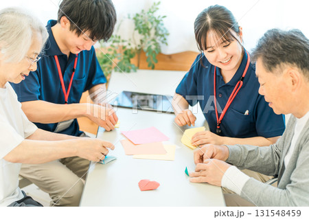 介護施設のリクエーションルームで折り紙を楽しむお年寄りと若い介護職員