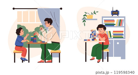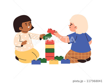 The vector set shows young kids assembling Lego blocks in a cozy room.