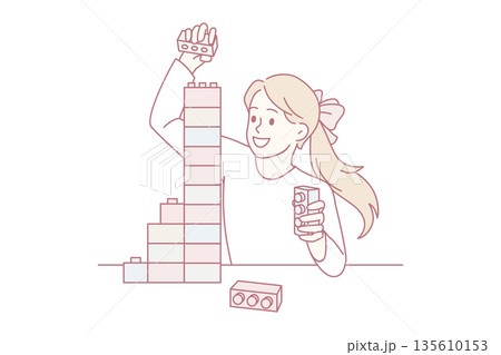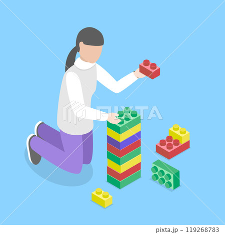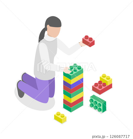3D Isometric Flat Illustration of Contrustion Blocks for Kids, Cheerful Little Girl Having Good Time