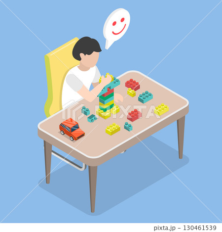 3D Isometric Flat Illustration of Educational Toys, Cheerful Boy Playing With Blocks At The Table.