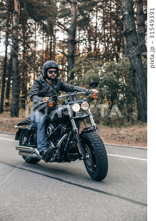 Biker in black clothes sits on a classic motorcycle and fastens his helmet in preparation for the ride. Right ammunition for a bike ride. Hobby or lifestyle of grown up men