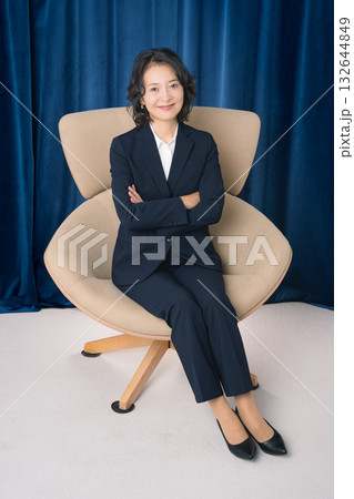 大きな椅子に座るミドルビジネスウーマン