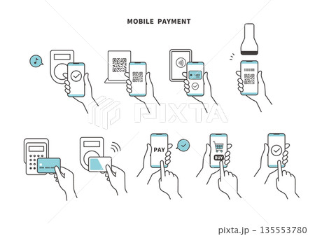 スマホ決済・QRコード・タッチ決済のシンプル線画イラストセット(ブルー)