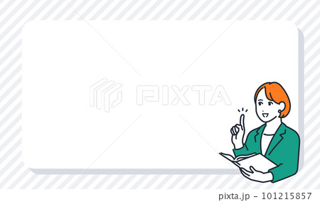 ストライプのフレームと資料を持って説明する若いビジネスウーマンのシンプルなベクターイラスト素材