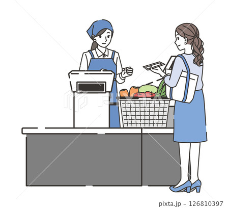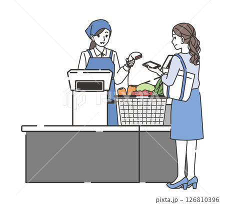 スーパーのレジでスマホ決済をする女性のイラスト