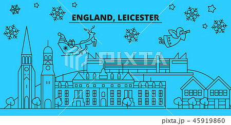 Great Britain, Leicester winter holidays skyline. Merry Christmas, Happy New Year decorated banner
