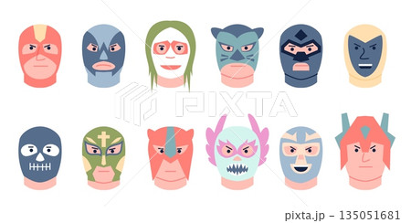 Mexican wrestler masks. Wrestler heads in mask, horrible lucha libre fighters accessories. Traditional mexico wrestling show avatars, recent vector set