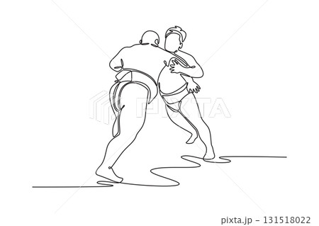 Continuous one line drawing two Sumo wrestlers locked in standing embrace, gripping each other's belts in fierce struggle for control and leverage. Single line draw design vector graphic illustration