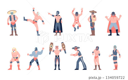 Mexican wrestling fighters. Fight show wrestlers wear bright horror maskr and costumes. Fighters lucha libre in various sport poses, wrestling recent vector characters