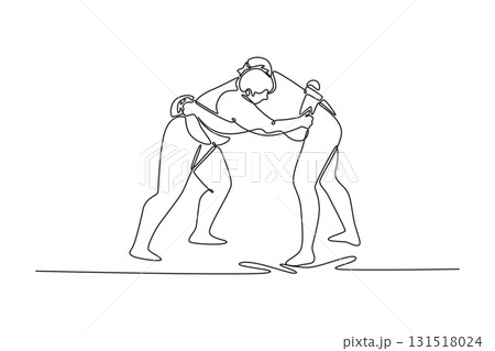 Continuous one line drawing two Sumo wrestlers locked in low, forward-leaning grapple, fiercely pushing against each other for control of the belt. Single line draw design vector graphic illustration