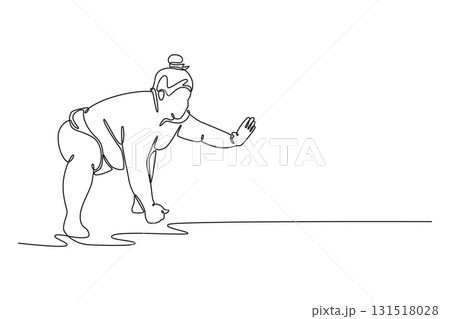 Single one line drawing large Sumo wrestler in crouched starting position, hand reaching toward the ground, readiness before match begin. Modern continuous line draw design graphic vector illustration