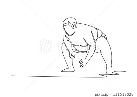 Single one line drawing large Sumo wrestler in a deep, wide, starting stance with clenched fists, explosive power and focus before match begins. Continuous line draw design graphic vector illustration